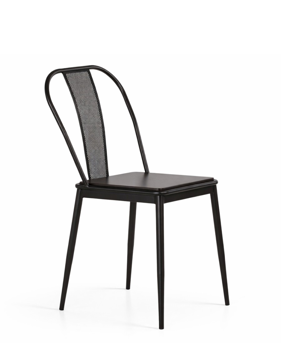 A cadeira Still conta com sua estrutura e encosto em metal, e seu assento possibilita a opção em madeira maciça ou acabamento em laminado.